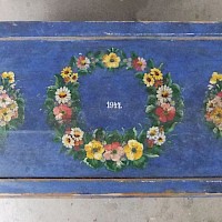 Die alte Bauerntruhe des Schnetter Typs von 1947 besticht durch ihre leuchtend ultramarinblaue Farbe.