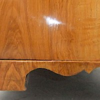 Das Erbstück hatte besonders auf der Deckplatte einige Schäden mitbekommen und an einem Hinterfuß war das Furnier verloren. Während die Abnahme oder Regenerierung eines alten Lackes und die Herstellung einer neuen Schellackoberfläche immer befriedigende Arbeiten sind, möchte ich hier die Furnierergänzungen am Hinterfuß hervorheben. Da ich das Glück hatte, optimal passende Sägefurniere zu finden, ist diese Ergänzung besonders gut gelungen.