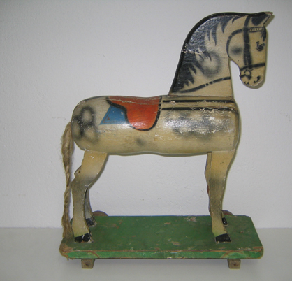 Odenwälder Schoggelgaul Bei diesem historischen Spielzeug, einer regionalen Spezialität aus dem Odenwald, wurde der Hals wieder mit dem Korpus verleimt und ein Schwundriss im Rumpf ausgespant und retuschiert. Zwei der Räder wurden ergänzt und dem Erscheinungsbild der beiden originalen Räder angepasst.