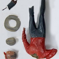 Cowboy Levis - Diese Werbefigur aus den 40er- 50er Jahren aus Hartgummi war durch einige Stürze mehrfach gebrochen und auch bereits unsachgemäß geklebt worden. Ziel der Restaurierung war eine haltbare Klebung und Kittung, sowie eine Ertüchtigung der Konstruktion, bzw. Verlagerung des Schwerpunktes. Die Hand mit dem Brandeisen wurde nicht ergänzt.
